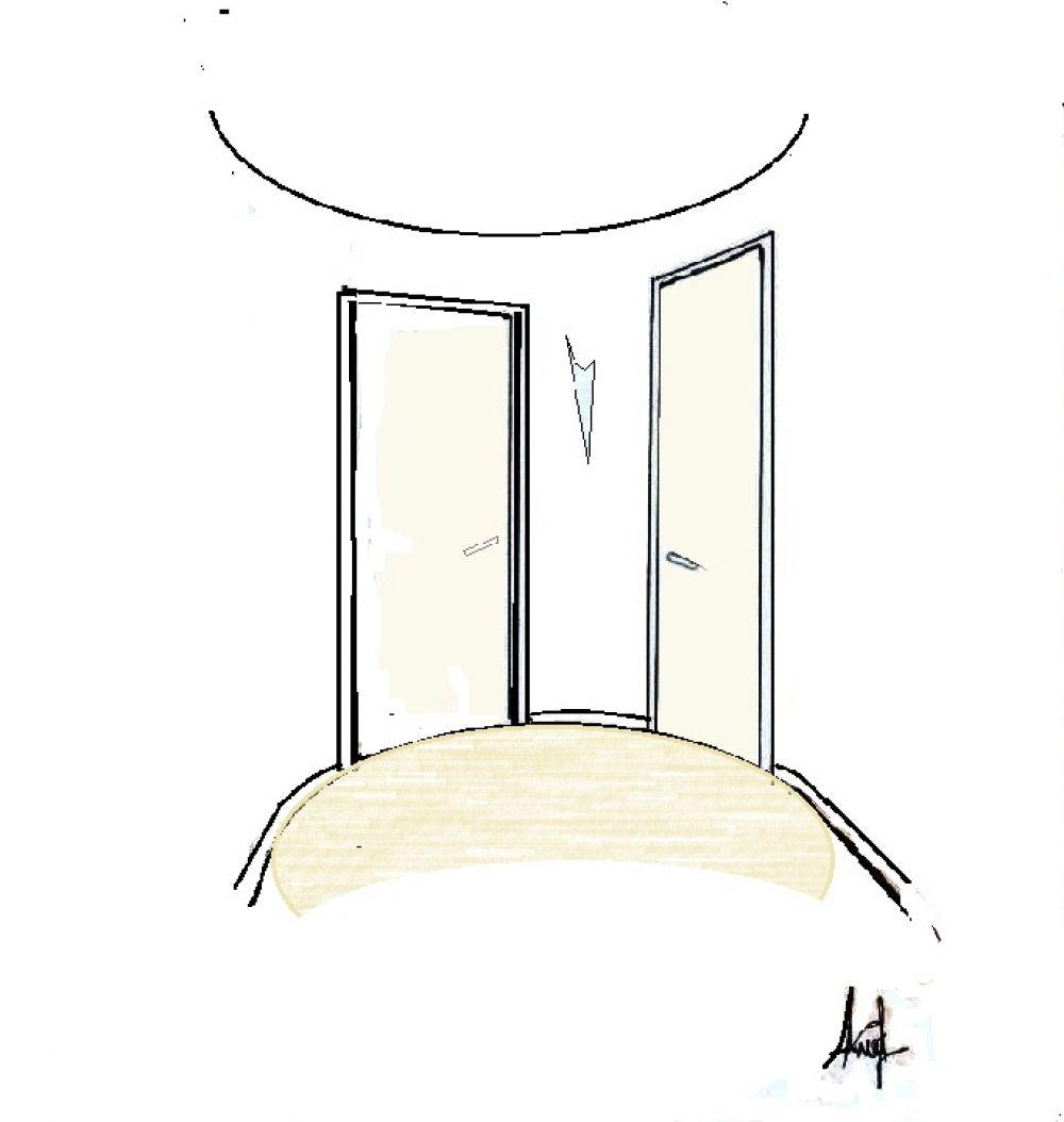 Condivido la brillante idea di jovis, nel eliminare i due spigoli delle camere. Penso che in questo caso vi siano due opzioni per le "due porte d'ingresso" da realizzare una a battente curve come hai rappresentato, oppure la seconda dal costo più contenuto e commerciale standard, creando ovviamente una apertura in diagonale.“Ecco una soluzione veloce che elimina gli spigoli e lascia bagni e cucina tutti in linea per facilitare l'impiantistica.”
