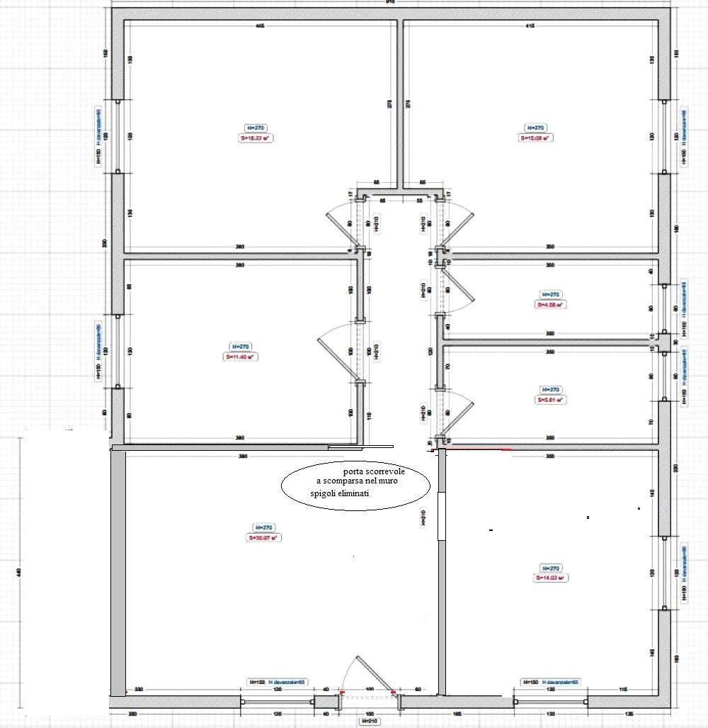 A questo punto la pianta globale è rettangolare e non vi sono spigoli nel salone, risultando a sua volta rettangolare. Una porta a scomparsa nel muro separa la zona notte servizi dalla zona giorno. Se hai difficoltà nella ricerca di porte a scomparsa nel muro, ti posso citare alcune aziende produttrici come Eclisse, Bertolotto, Garofoli oppure nella grande distribuzione come Iperceramica.“Ok, quindi questa soluzione sarebbe preferibile a livello di costi. La metratura è la stessa, perché ho allargato bagni e camera e stretto la cucina. Per come ho pensato gli spazi la pianta completamente rettangolare non riesco a farla.”